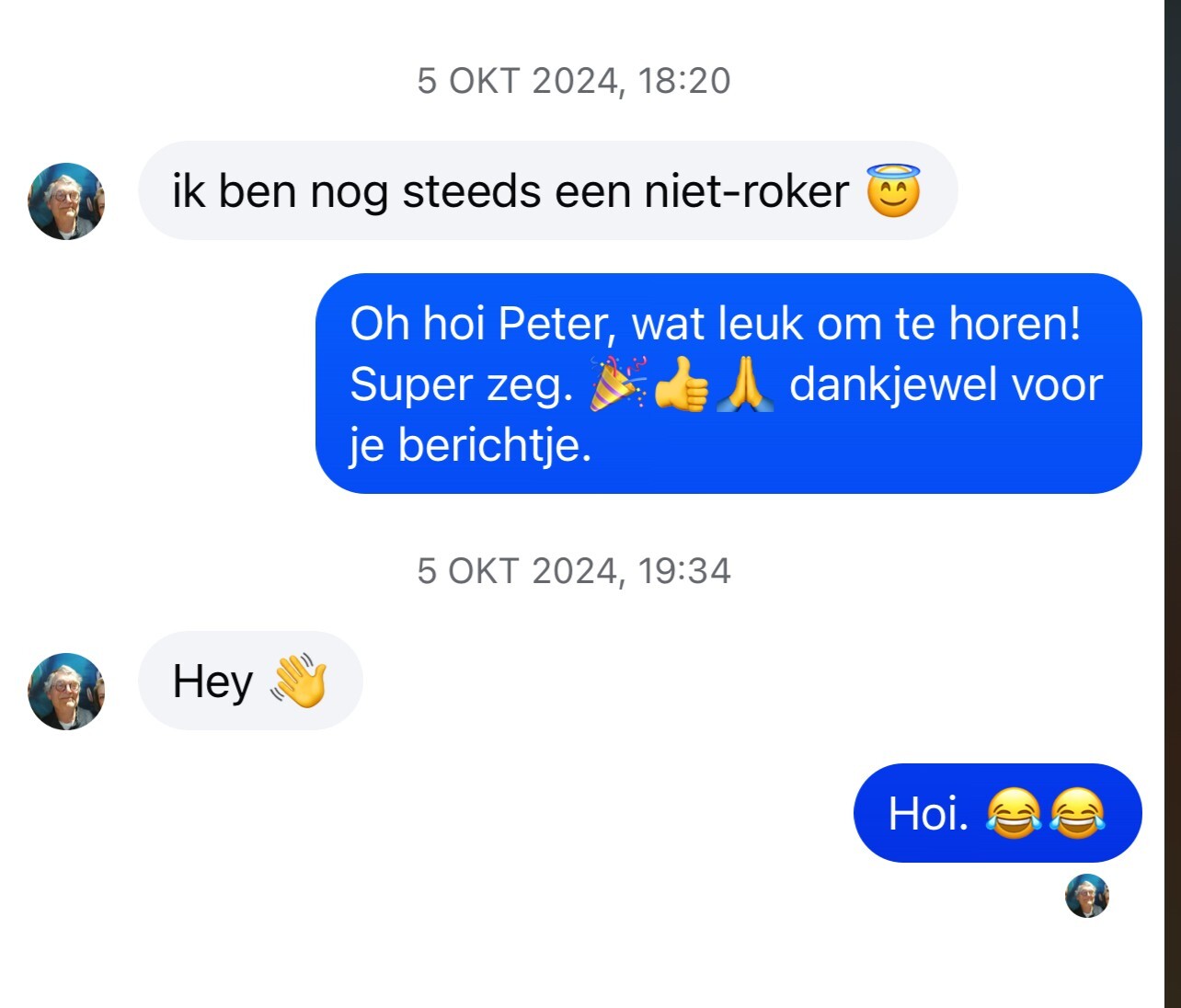 Na meerdere stoppogingen is het mij dan eindelijk gelukt! Ik ben al dik een jaar rookvrij en geniet elke dag van mijn vrijheid en mijn gezondheid.
